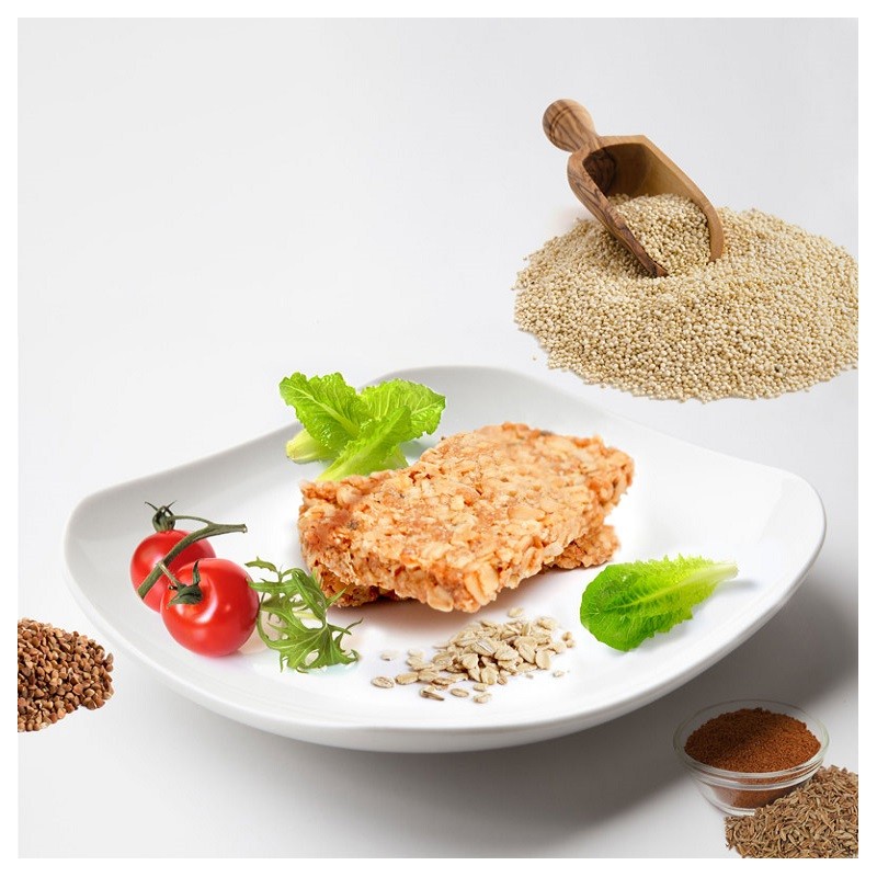 Συστατικά: Φακόρυζο, μίγμα λαχανικών (λάχανο, καρότο, πράσο, σέλινο, σόγια, σκόρδο), ελαιόλαδο, κινόα (6%), φαγόπυρο, κρεμμύδι, τσία, ρεβύθι, καρότο , σόγια, αρακάς κτψ, καλαμπόκι κτψ, νερό, αλεύρι σίτου, νιφάδες πατάτας (πατάτες), νιφάδες βρώμης (10%), ηλιόσπορος, ηλιέλαιο, τρίμμα ψωμιού (αλεύρι σίτου, αλάτι, αυξητικός παράγοντας Ε 503-ii, αντισυσσωματικός παράγοντας Ε 535, χρωστική ουσία Ε 170), μαϊντανός, αλάτι, κύμινο, κιουμέλ (άγριο κύμινο) (0,5%), πιπέρι. Μπορεί να περιέχει ίχνη από σουσάμι.